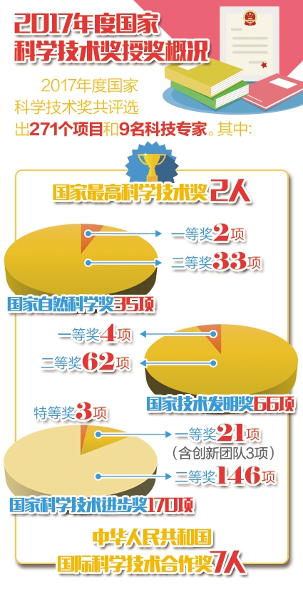 1月8日,2017年度國家科學技術獎勵大會在北京人民大會堂隆重舉行。2名科學家獲得國家最高科學技術獎,271個項目獲得國家自然科學獎、國家技術發明獎、國家科學技術進步獎三大獎,7名外籍專家獲得國際合作獎。