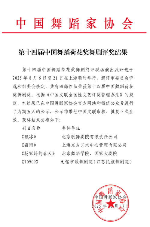 近日,第十四屆中國舞蹈荷花獎舞劇獎評選結果揭曉,由無錫市歌舞劇院與中國船舶集團有限公司旗下第七〇二研究所聯合創作的原創舞劇《10909》從眾多優秀作品中脫穎而出,成功摘得荷花獎舞劇獎。