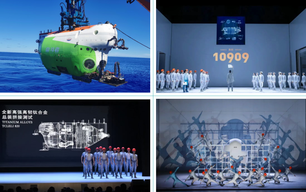 《10909》舞劇以七〇二所科研工作者為原型,以“奮斗者”號全海深載人潛水器在馬里亞納海溝首次探底10909米為題材,通過精湛的舞蹈語言與創新的舞臺表現,生動再現“奮斗者”號全海深載人潛水器研制、下潛、海試的奮斗過程。該劇先后獲評第十四屆全國舞蹈展演優秀劇目、國家藝術基金2024年度資助項目、2022年江蘇省重大題材文藝創作項目等。