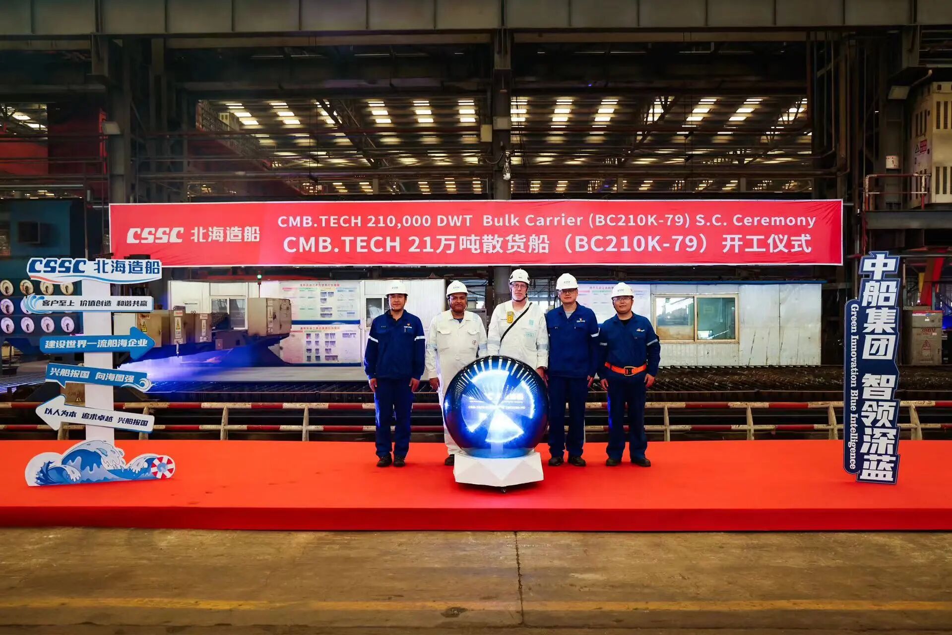 北海造船在2號塢順利完成為比利時(shí)CMB.TECH公司建造的21萬噸散貨船56號船與63號船完成鋪底節(jié)點(diǎn)。該型船采用“氨預(yù)留”綠色設(shè)計(jì),為未來使用氨燃料動(dòng)力預(yù)留了改造空間。